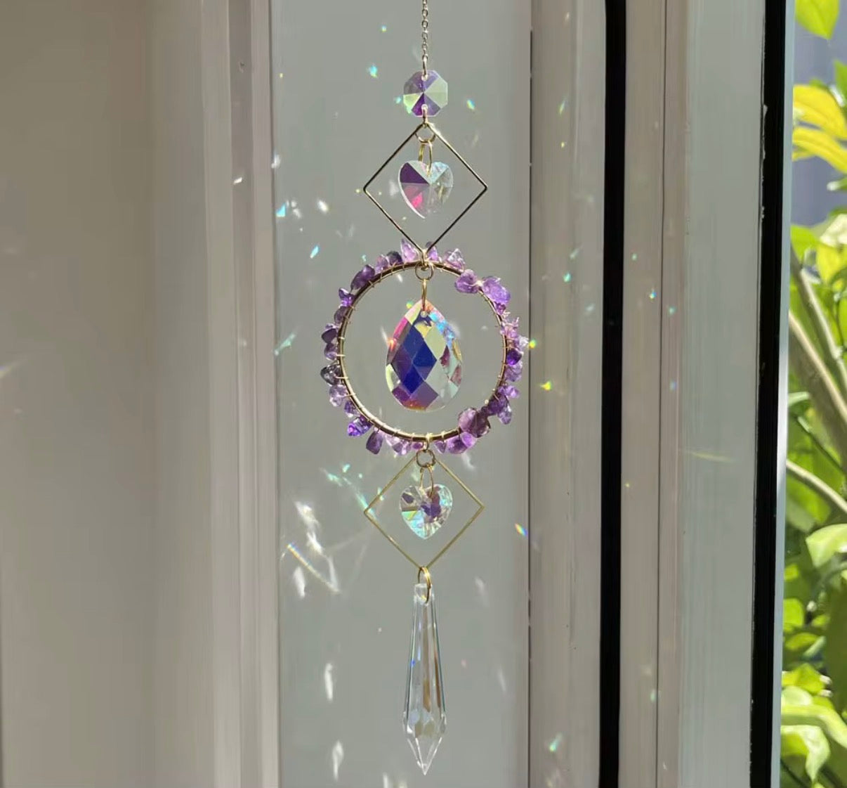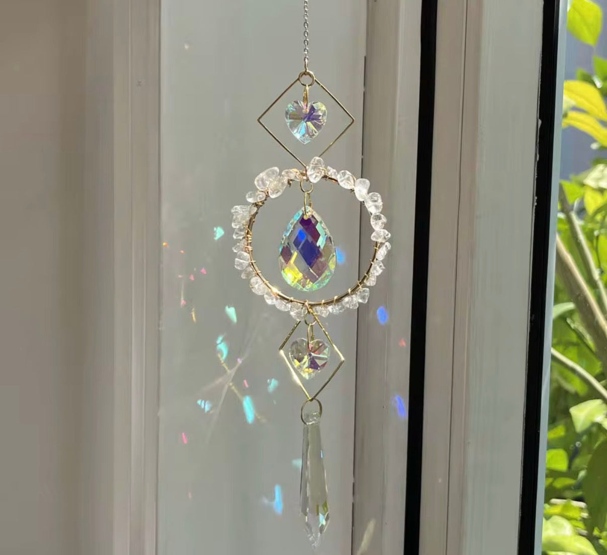 This sun catcher is made with natural crystals, designed to catch the light and fill your space with warmth and beauty. When placed near a window, the crystals reflect sunlight and create a soft, uplifting glow throughout the room.